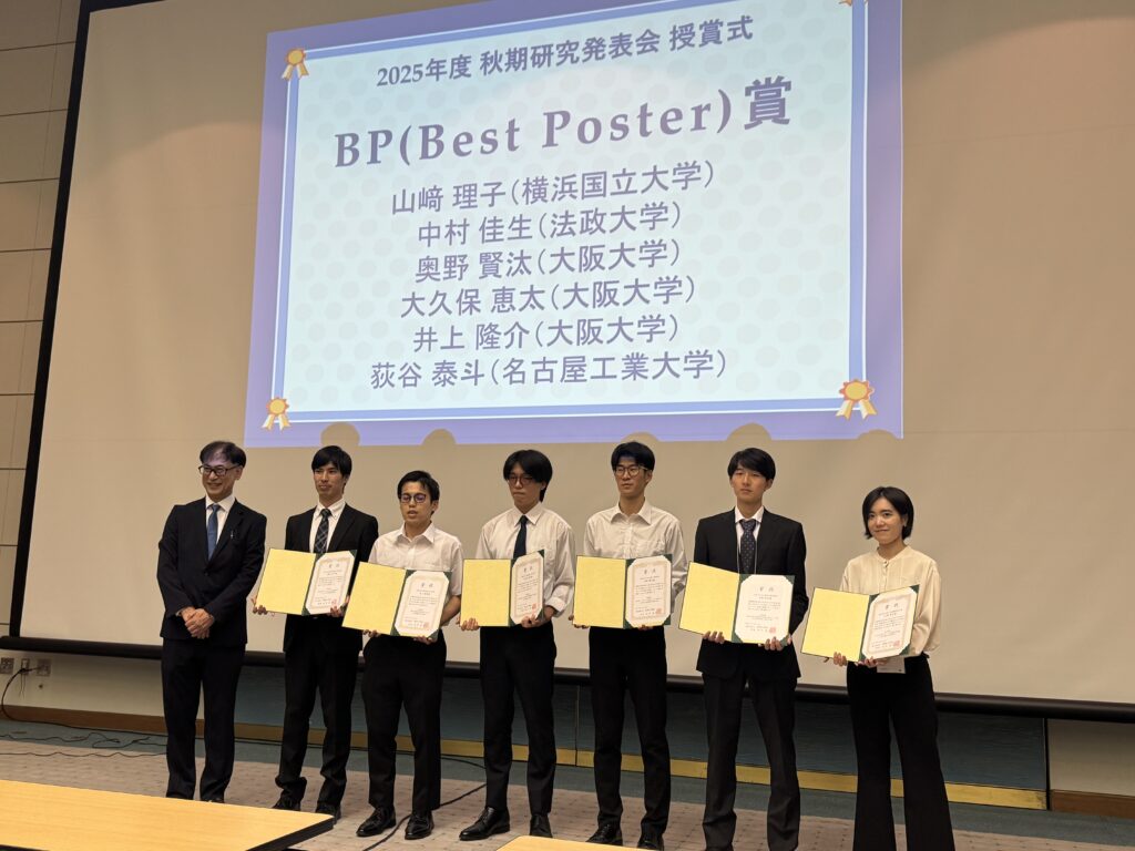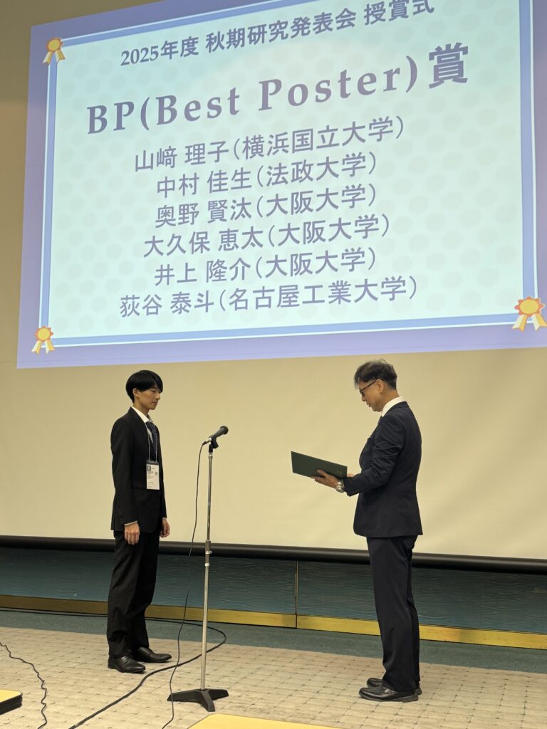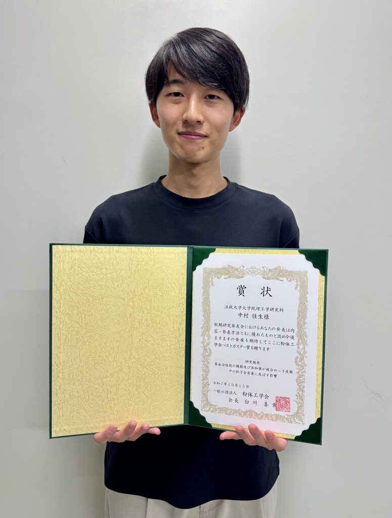 2025年10月14日~15日にインテックス大阪で開催された粉体工学会2025年度秋期研究発表会で中村佳生さん(応用化学専攻修士課程2年)がBP(ベストポスター)賞を受賞しました。